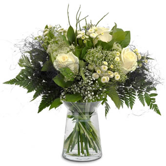 Een sereen boeket met witte rozen, gipskruid en zachtgroene accenten – een tijdloos symbool van zuiverheid, liefde en respect.